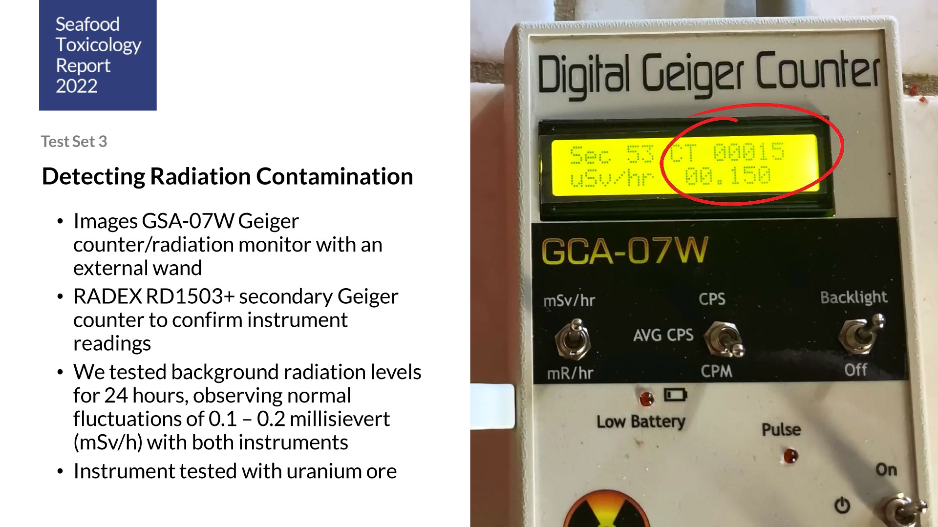 We tested for chemical, radiation and heavy metal contaminants. Traces of mercury, cadmium and arsenic were detected within normal and safe range.