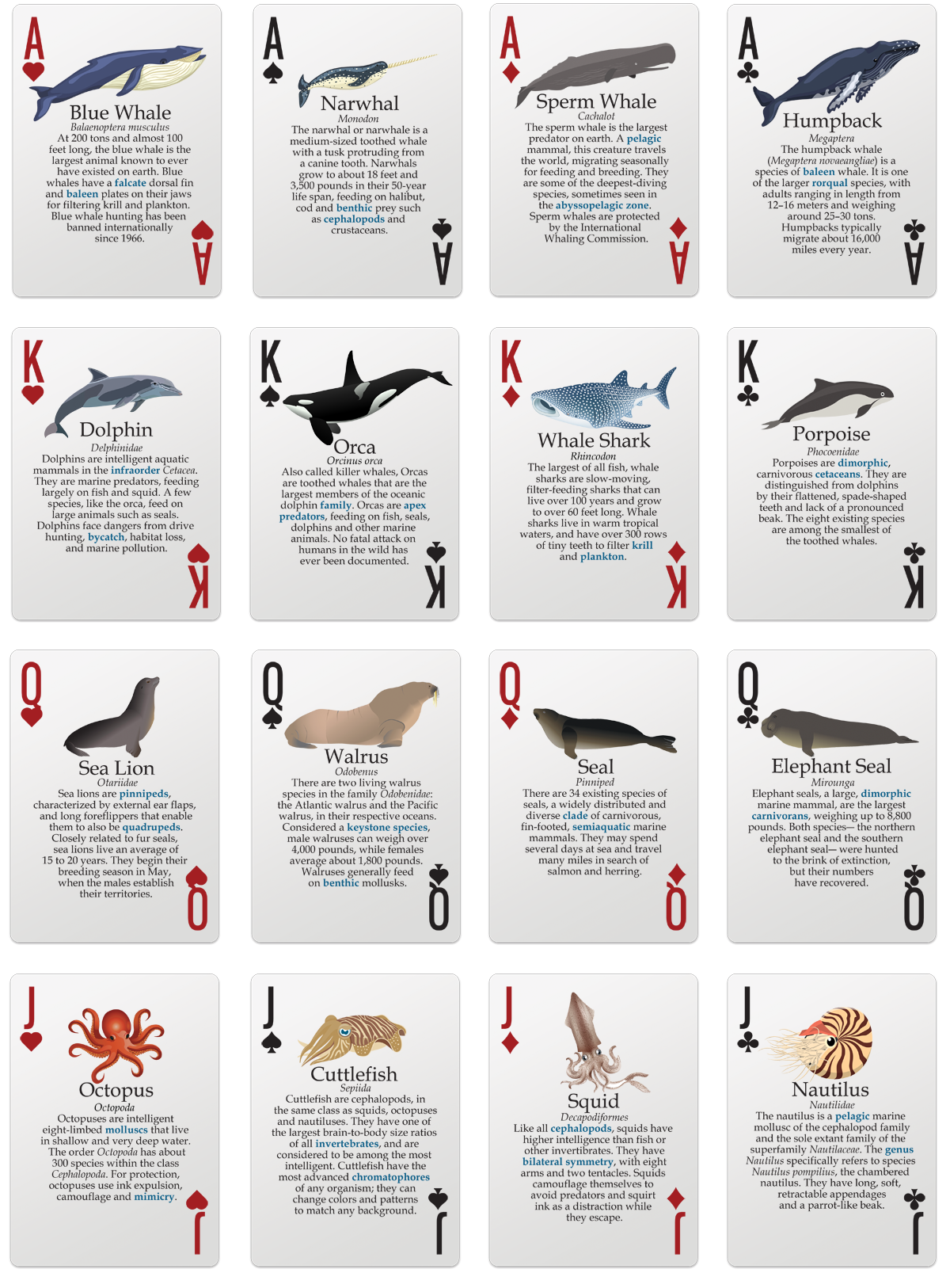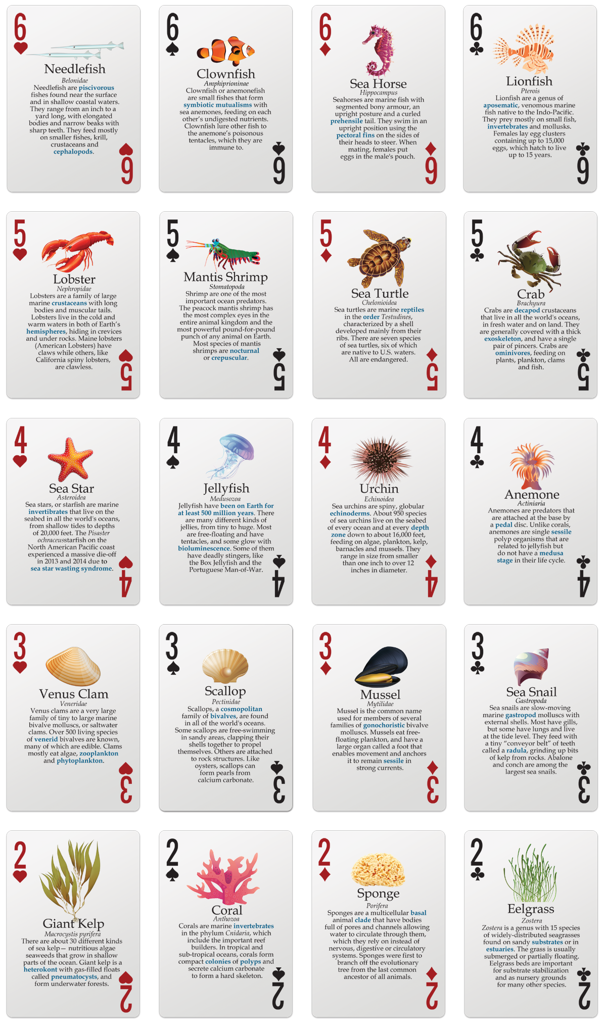 This extraordinary learning game kit includes bingo, card games, trivia and flash cards. It comes with unique, high quality waterproof bingo cards for 25 players, a deck of encyclopedic Marine playing cards, 150 polished round abalone sea shell chips, game instructions, and two neoprene zipper bag cases.